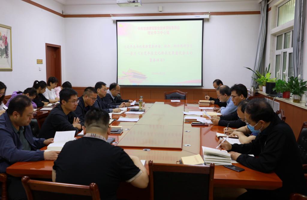 李维敦同志领学了《习近平在文化传承发展座谈会上的重要讲话》。习近平总书记在讲话中强调,在新的起点上继续推动文化繁荣、建设文化强国、建设中华民族现代文明,是我们在新时代新的文化使命。要坚定文化自信、担当使命、奋发有为,共同努力创造属于我们这个时代的新文化,建设中华民族现代文明。李维敦介绍了讲话的发表背景和主要内容,并结合学院在传统文化、非遗传承等方面的成果,围绕红色教育阵地、传统文化阵地和专业文化阵地这三个方面的阵地建设工作,谈了感想和体会。