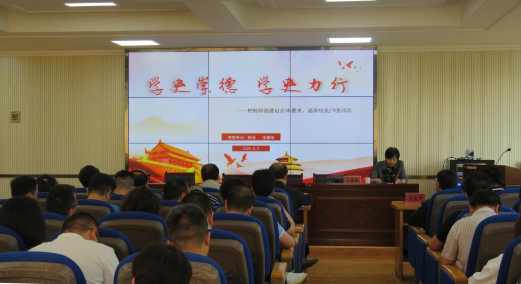 6月7日,学院党委书记、院长王娟丽以“学史崇德、学史力行——把握师德建设总体要求、涵养优良师德师风”为主题,为全体中层干部、教师代表上了一堂生动的主题党课。